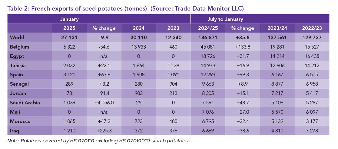 French seed potato exports jumped 35.8% to 186 871 tonnes, despite a 9.9% drop in January. The average price (€619/t) was almost unchanged from last year.
