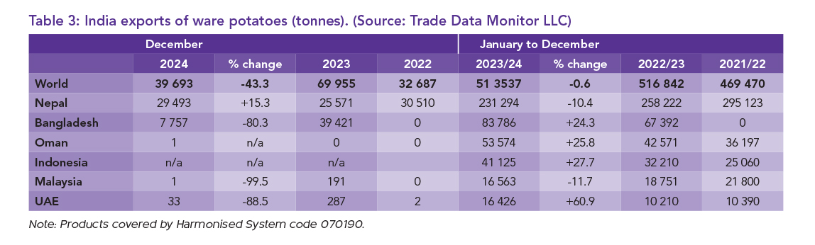 Ware potato exports fell 43.3% in December but ended last year nearly flat, only 0.6% lower year-on-year. Strong prices lifted export values to a record US$110 million. Nepal remained the largest buyer, though sales dropped 10.4%. Bangladesh saw a 24.3% increase in purchases last year, while exports to Oman earned more revenue despite lower volumes.